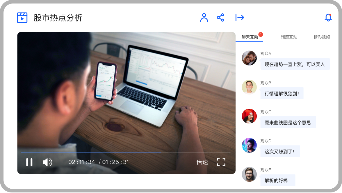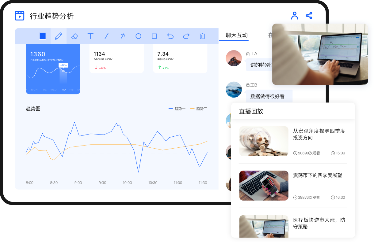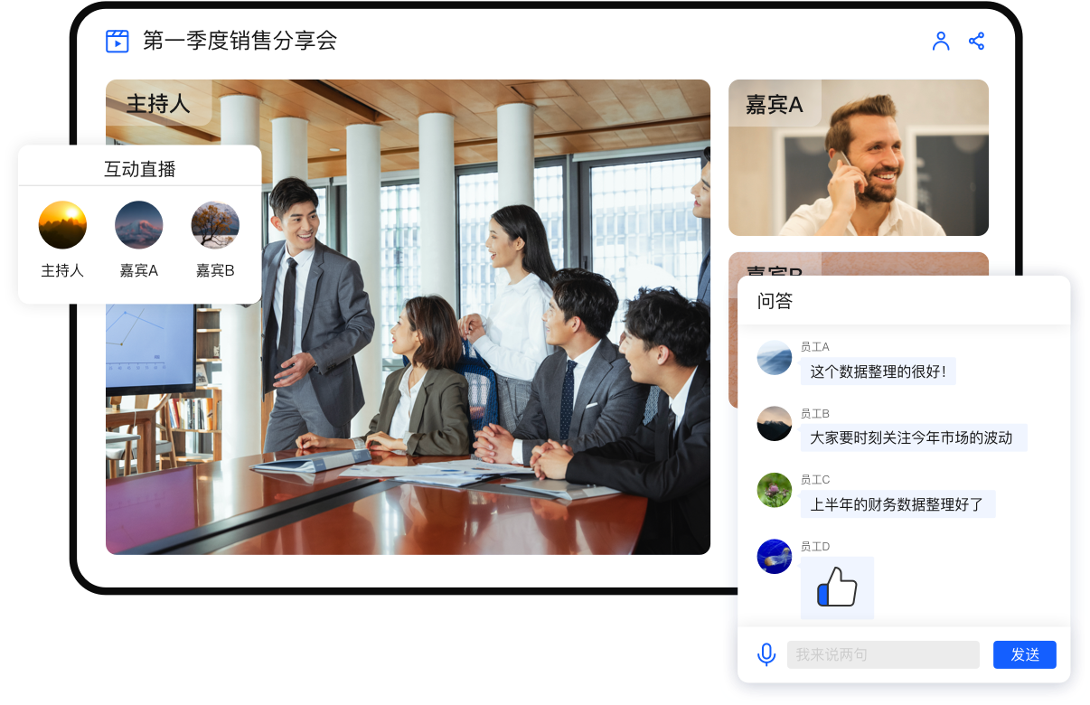 【远程视频协作、办公会议直播、金融知识经验分享、工作汇报、线上招聘协作、领导人讲话、开门红启动会】