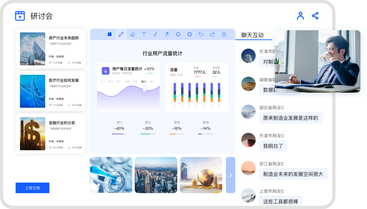 随时随地组织培训直播,通过签单、文档演示、白板批注、试卷、问答等工具提升培训效率