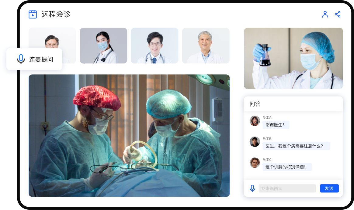 【在线健康咨询、远程会诊、检测服务、远程手术指导、医学知识讲堂等场景】
